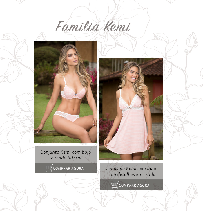 A Família Kemi é confeccionada em tecido de toque macio e suave, perfeito para os dias quentes de verão. Disponível nas cores mescla e rosa, a família é composta por um conjunto com bojo com as laterais do sutiã e da calcinha em renda e uma linda camisola sem bojo com drapeado e detalhe em renda no decote e abaixo dos seios. Impossível não se apaixonar!
