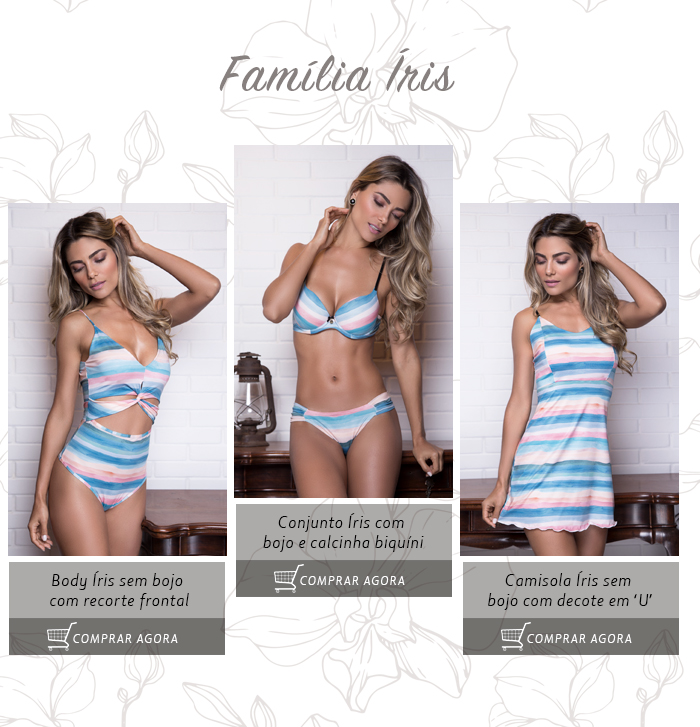 A Família Íris e confeccionada em tecido com estampa digital, disponível nas cores azul e vermelho. O conjunto com bojo tem a modelagem tradicional e a calcinha possui as laterais largas com um detalhe franzido. O body possui um lindo detalhe cruzado na frente e decote em “V” nas costas. A Camisola possui o caimento leve e suave ao toque. Toda a família íris é alegre e divertida, perfeita para levar mais cor ao seu dia a dia.