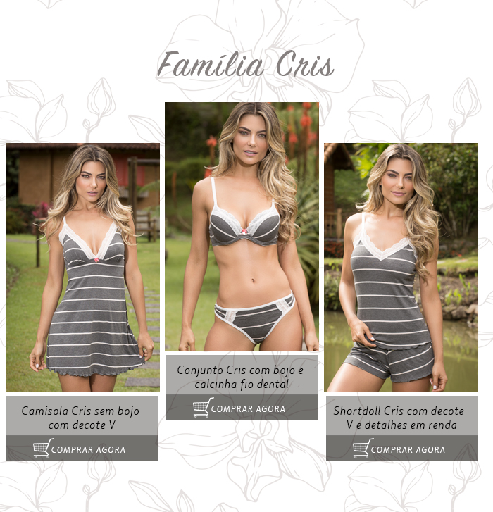 A Família Cris possui tecido em base de viscose com aparência nobre e aspecto delicado. Com um caimento leve e suave, está disponível na estampa mescla com listras off White. A família é composta por um conjunto de bojo com calcinha fio dental e detalhes em renda, um short doll com decote em "V" ideal para as noites de verão e uma camisola sem bojo também com decote em "V" e detalhes em renda.