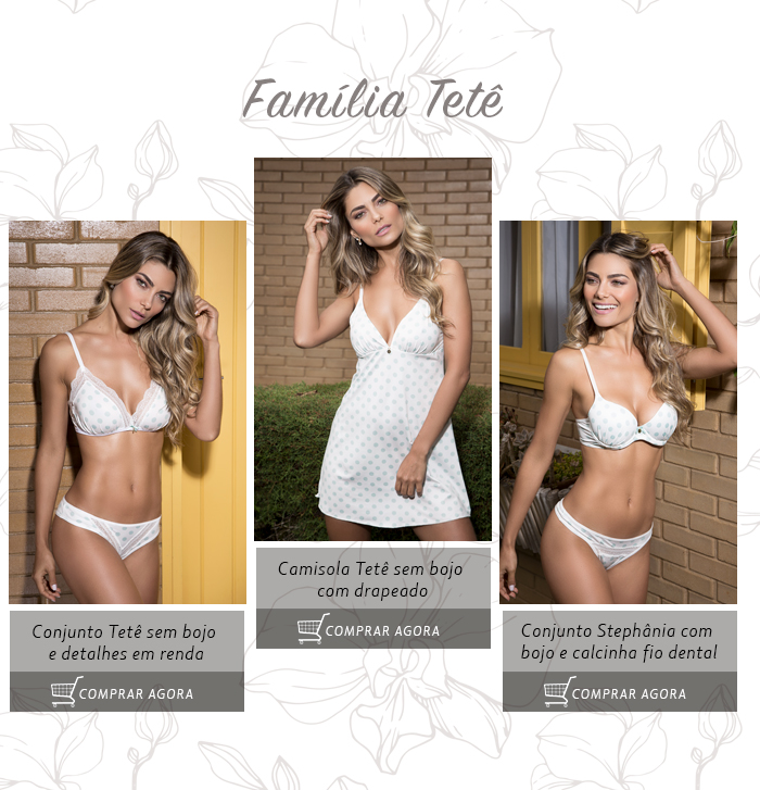A Família Tetê é composta por um conjunto com bojo, um conjunto sem bojo e uma camisola que esbanjam delicadeza. O caimento leve e o toque suave e refrescante do tecido é o que deixa essas peças ainda mais especiais. As estampas estão disponíveis nas cores verde, rosa e amarelo e em todas elas você vai encontrar detalhes em rendas e drapeado no bojo que trazem um toque a mais de romantismo aos produtos.